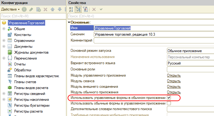 2. Включите режим "Использовать управляемые формы в обычном приложении".