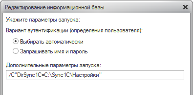 Если у вас серверная база, или вы почему-то не хотите использовать подкаталог из предыдущего способа. Тогда положите Конфиг.xml в подходящий каталог - какой вам самим нравится, и укажите его в параметре запуска для этой базы. В окне выбора базы (при запуске 1С) - кнопка "Изменить", на последнем экране в поле "Дополнительные параметры запуска" например так: /C"DirSync1C=C:\Sync1C\Настройки".