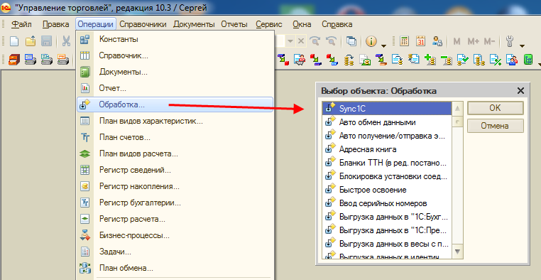 Теперь в режиме предприятия можно открыть Sync1C через меню Операции / Обработка / Sync1C.