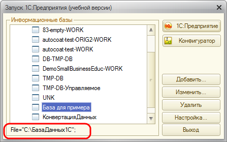 Если затрудняетесь определить каталог базы: в диалоге запуска 1С путь к каталогу выбранной базы высвечивается в левом нижнем углу (слово File там означает, что это файловая база):